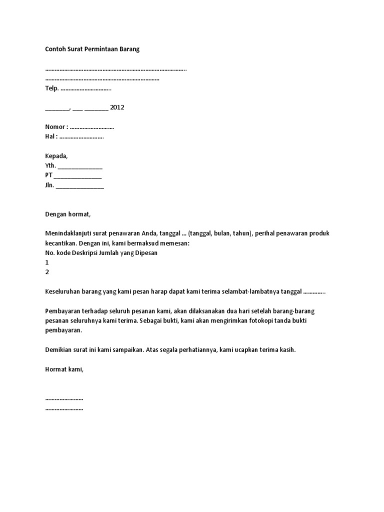 Contoh surat permintaan order barang. Check spelling or type a new query. Maybe you would like to learn more about one of these? We did not find results for: